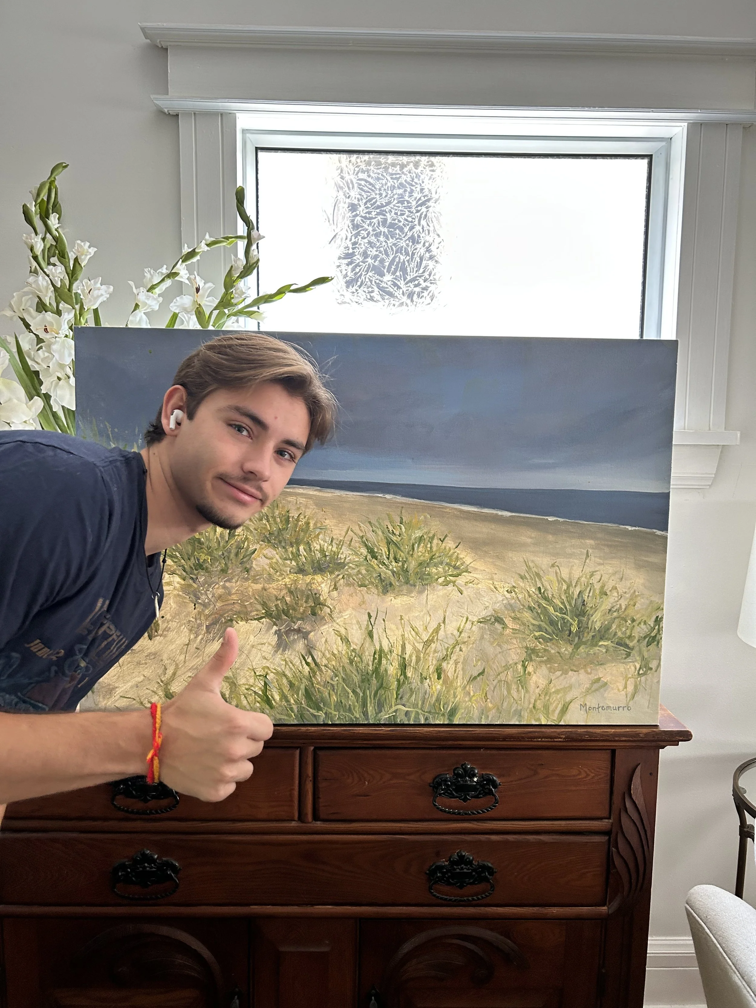 Trouble Brewing captures that charged, unforgettable moment when the air shifts, the light changes, and the ocean seems to hold its breath. In this acrylic seascape painting, I painted windswept dune grass bending under a gathering storm, their greens and golds alive against the soft beige of the sand. The horizon divides the deep blue sea from the dramatic sky, heavy with approaching clouds, evoking both beauty and anticipation. This contemporary coastal artwork is perfect for beach lovers, collectors of ocean-inspired wall art, and those drawn to the wild, untamed side of nature. Signed, glazed, and prepared with wire for immediate hanging and enjoyment. This painting once graced the wall of our beloved cottage.